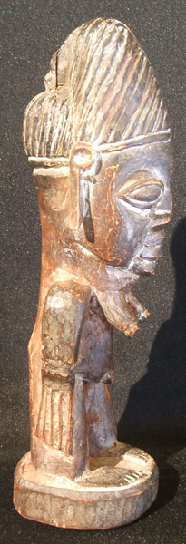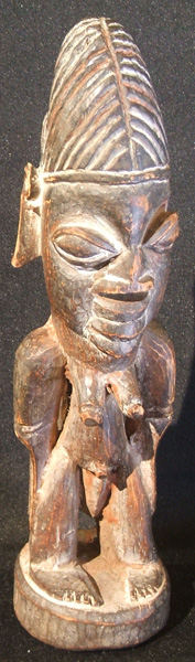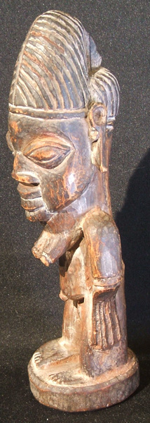 Twins are considered to be powerful spirits, so upon the death of one or both twins, the ibeji, a small wood figure, is carved to represent the deceased child.  The ibeji is treated just as if the child were still alive.  It is bathed. clothed, fed and generally looked after by the mother to assure that only good fortune is brought to the family. Ibejis are not carved to look like children but instead they appear as either male or female adults.